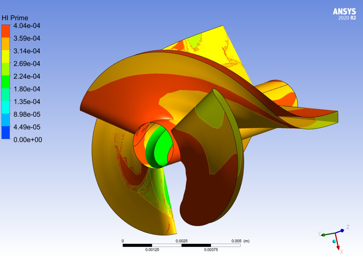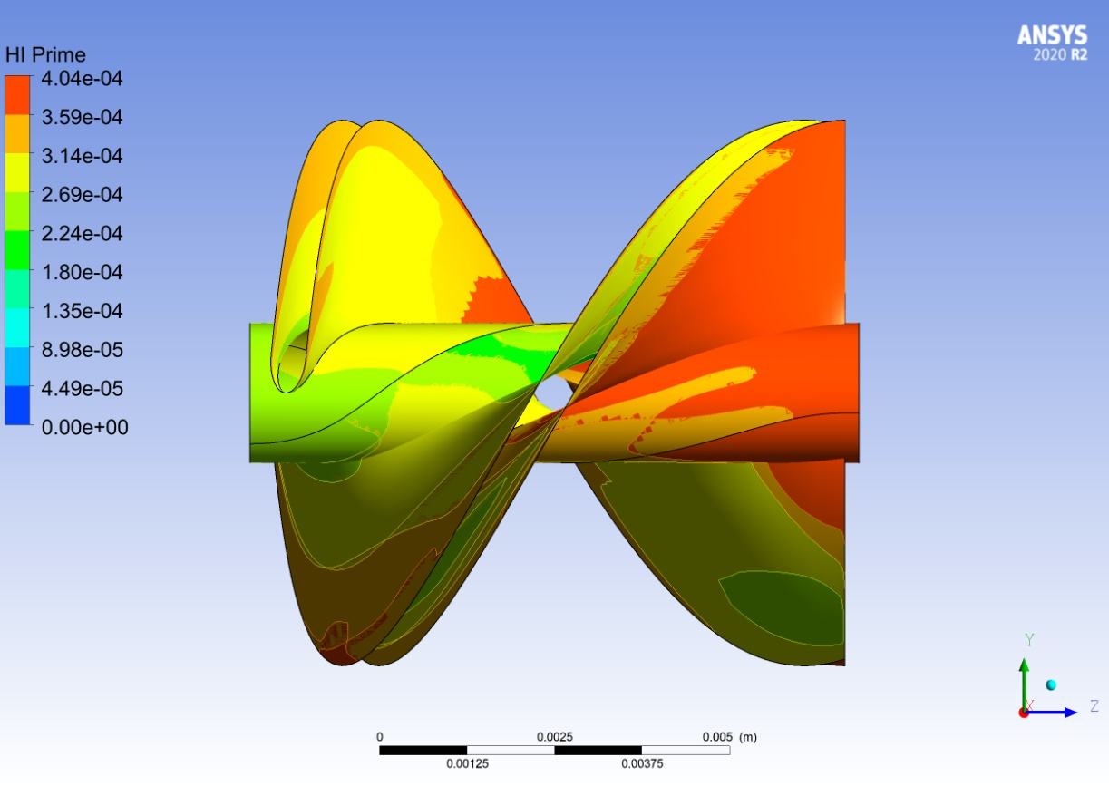 These are the areas where the blood experienced the most shear stress and for the longest period of time. In this domain, the highest value of HI’ was 3.81e-4. This translates to a HI index of 5.49e-9.